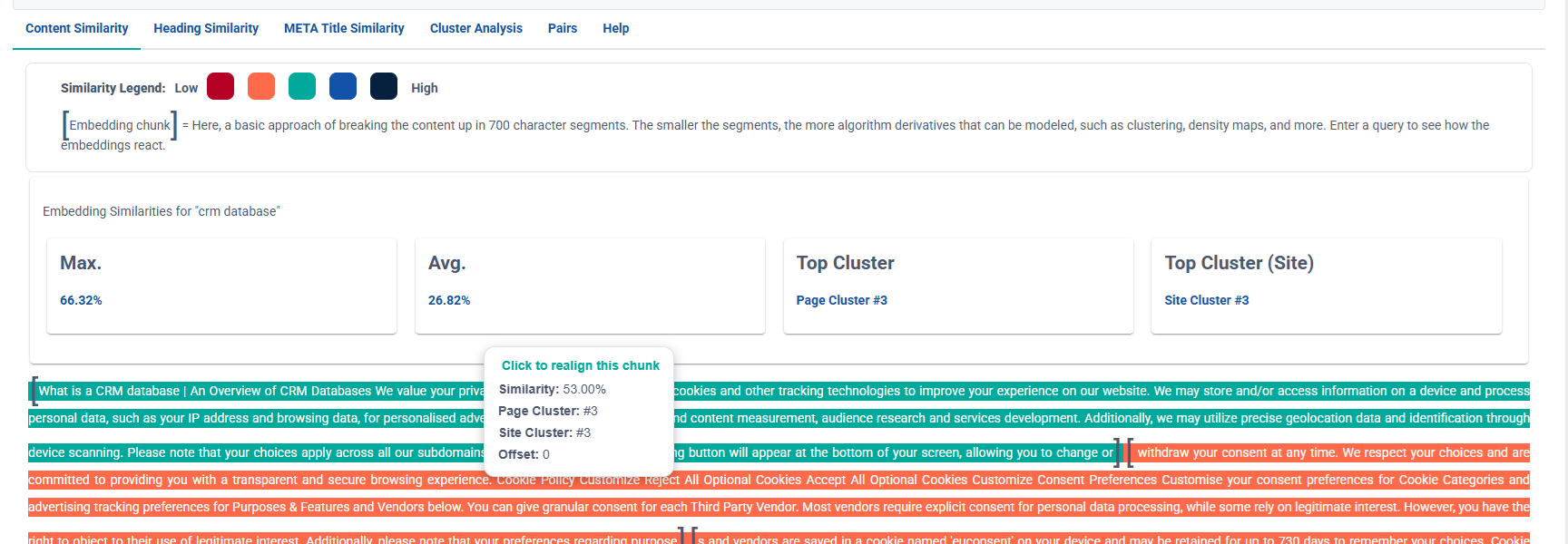 Top Cluster Similarity: This metric analyzes and compares the core thematic embedding clusters of each page — a powerful way to spot overlapping topics and potential keyword cannibalization.