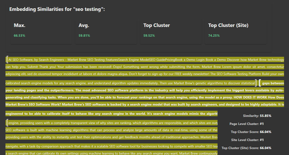 - Updates to Existing Reports:Â The Market Brew Conversation report is now generated immediately after Analysis Group setup! No need to re-crawl each site at least twice before generating the report. This will further automate the process of prospecting, and for our A La Carte customers, it will generate a link to the report immediately upon purchasing the product. All trend analysis on the Market Brew Conversation report is removed for the first report (as there is only one snapshot of data at this point). All competitor âBiggest Weaknessâ and âTrend Analysisâ sections have been removed: the Conversation is solely focused on the target site now, resulting in more focused and less noisy content. Both the Link Flow Finder and the Domain Rank Finder recommendations will also be listed on the Simulations screens as well as the automated Conversation reports, when applicable. You should see these start to show up as your sites are re-crawled and new reports are generated. We believe that these two improvements to the Market Brew product make it both incredibly powerful and easier to use. We are constantly striving towards full automation and these enhancements make good on that promise. In addition to the two major enhancements mentioned above, we have added detailed analysis of the HTML scoring, including featured text fragments, giving users transparency into the underlying Lucene Query Parser scoring. We have also added detailed analysis of the URL Host and URL Path much in the same way we show the META Title analysis, complete with highlights and recommendations. As you will see, there have been some major cosmetic upgrades to both the Simulations screen and the Conversation report, and improvements in rendering on both mobile and desktop browsers.