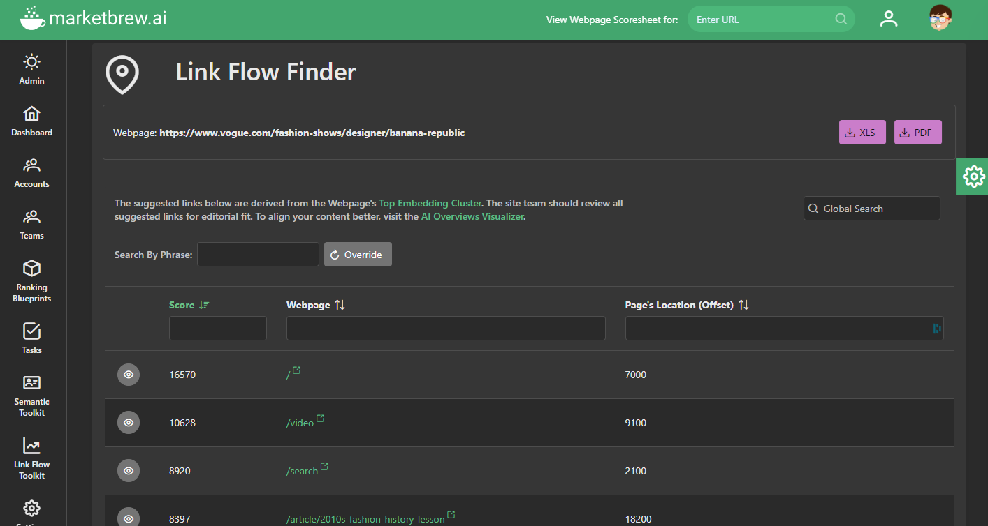 - Link Flow Finder: As you know, one of the most important features of Market Brew is the Link Flow Distribution analysis. We've had a lot of success stories from brands utilizing the Link Flow Distribution analysis to boost traffic to large portions of their sites, but this process has been far from automated. One of the biggest hurdles for this that we've seen is having the knowledge on the team to know where to strategically add Link Flow to certain pages in a site. With our new Link Flow Finder feature, this hurdle should be a thing of the past.