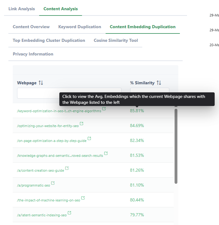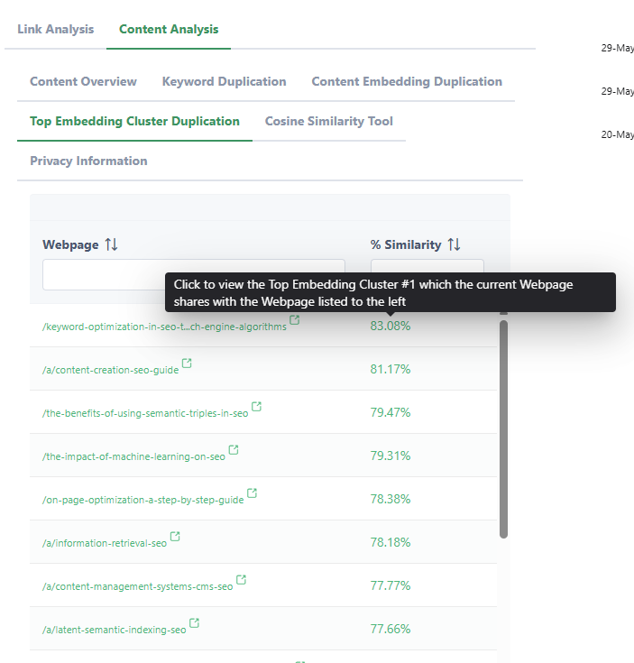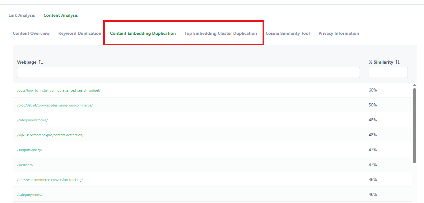 - Sorting and filtering by drift, similarity, cluster, or URL