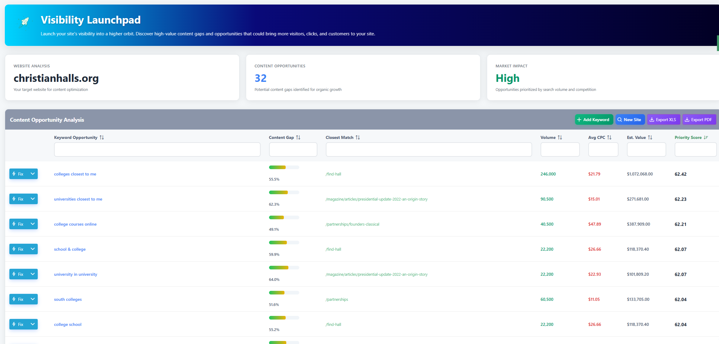 You get a full-site perspective on topic alignment, supported by an interactive radial visualization and page-level insights.
