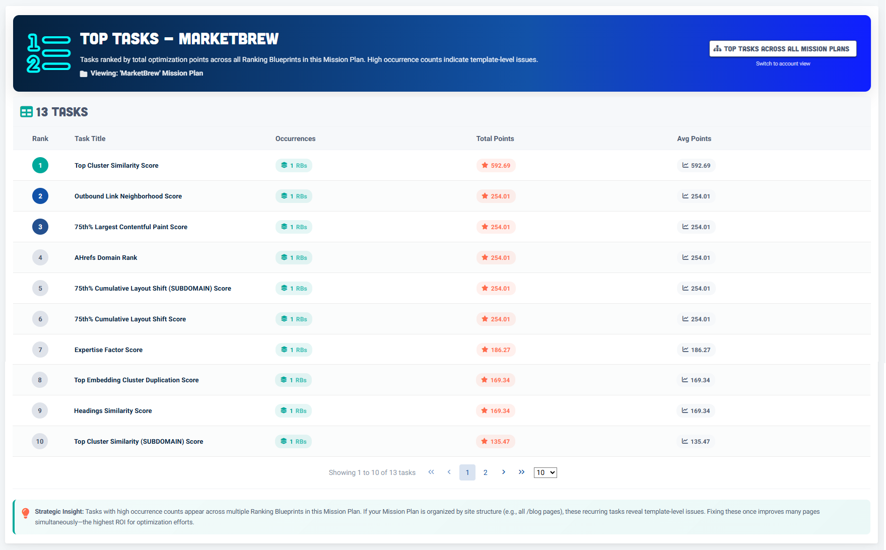 - Task System Refresh: Market Brewâs current task system will be expanded significantly and pushed to the Customer Home (top screen). While the previous task system relied on static alerts (shown on the SEO Alerts tab on Dashboard, Scoresheet, et al.), the new task system will rely heavily on the Biggest Weaknesses engine that drives the Simulation and Conversation Reports, but will also draw off of the existing Predictive Alerts and other subsystems. Tasks will introduce the concept of Categories, which will enable matching to different Team Roles (see below).New screens: Task -- shows the task, the category, the Query Potential, and options to complete the task. Workers will be able to mark the task complete, and also log how many hours they worked on the task. Market Brew may optionally add estimated hours to complete the task as well. Task Listing -- shows the list of tasks per Analysis Group. Includes Task hours / completed / assigned. Filterable by Category and Snapshot Date. Sortable by Query Potential. Team Tasks -- shows the list of all tasks per Team. Includes Task hours / completed / assigned. Filterable by Category and Snapshot Date. Sortable by Query Potential.