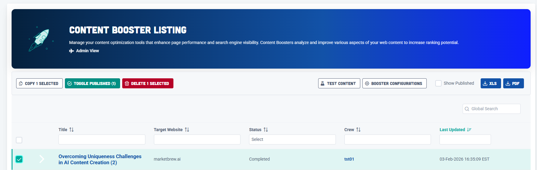 Users will be able to mark an individual Content Booster as Published.